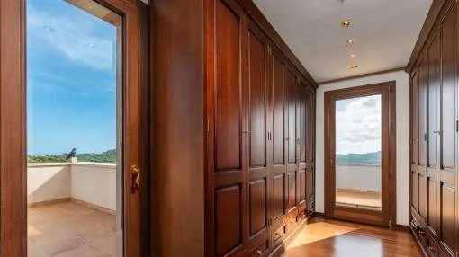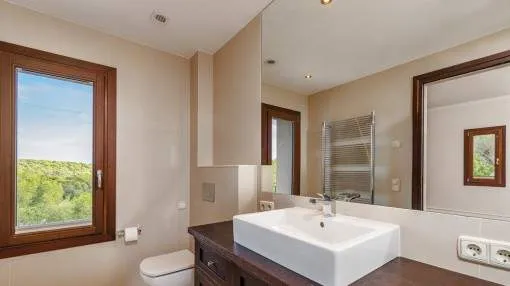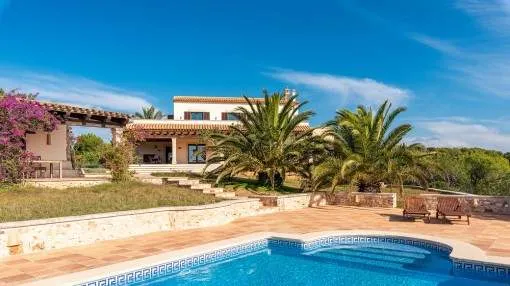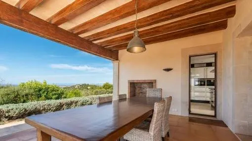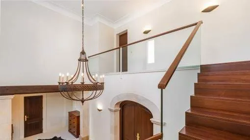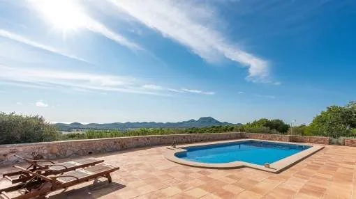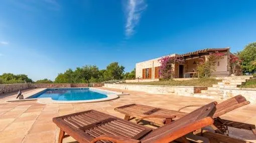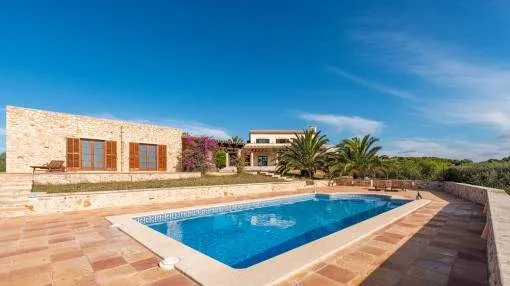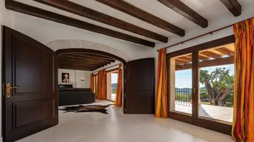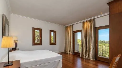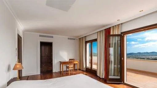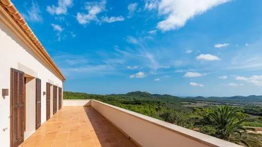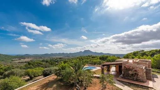 Details: A private approach road leads up to the highest point of Son Prohens where this stately property, situated on a small mountain, presents enchanting panoramic views. On the 16.371 sqm of land absolute tranquillity and privacy will be found. On one side the whole island can be seen as far as the Tramuntana mountains, and on the other side there are fantastic views as far as the sea and the island of Cabrera. A ridge of green hills, blending into the surrounding landscape, perfects the panorama. Upon entering the finca you are received by the imposing entrance area, presenting 478 sqm of living space spread over 2 levels. After the entrance comes a comfortable living area leading to a cosy dining area and the separate, fully-equipped kitchen. A corridor in the entrance area leads to 2 light-flooded bedrooms each with en-suite bathroom. Every room has access to a large terrace. A monumental Iroko-wood staircase leads to the upper floor with the large master-suite, a connecting room and a further bedroom. All rooms access the large surrounding terrace offering spectacular views of the island of Cabrera. The Mediterranean-style garden impresses with its expansive pool area and a separate guest house, and from the generously-sized sun terrace the unbelievably beautiful surrounding nature can be fully enjoyed. From sunrise to the, often spectacular, sunsets an unbelievably lovely atmosphere can be experienced and mild summer evenings enjoyed together with friends and family in the BBQ zone. Further features of this fantastic property include underfloor heating, air conditioning, and natural-stone floors. Truly a unique purchase opportunity. Returns from holiday lettings: For initial orientation you can use the “Porta Holiday Returns Calculator” without obligation to calculate your potential returns from holiday letting. NB: Due to the current legal situation it is possible that in certain municipalities renting restrictions may apply, or new touristic licences may not be granted. Your Porta Mallorquina real estate consultant will be pleased to advise you whether the property you have chosen is affected. Go to Returns Calculator. Location & surrounding area: Felanitx is located in the southeast of Mallorca being a small well-kept village with various shops for daily needs, nice cafés and restaurants. The landscape is partially hilly and wooded, partially plain and vast, ideal for those seeking tranquillity and for lovers of nature. The small harbour city of Portocolom and the romantic bays on the east coast are approx. a 15-minute drive away.